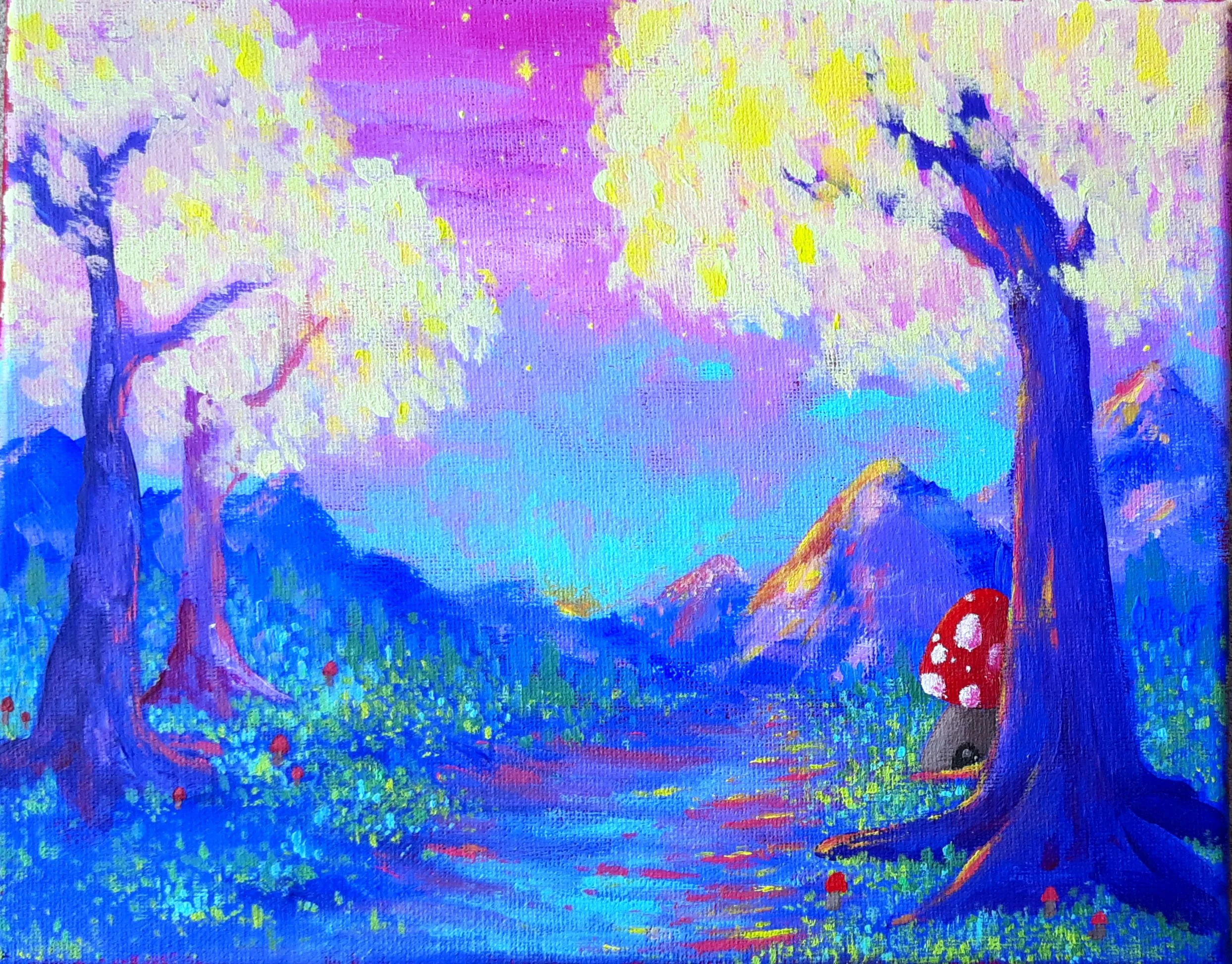 After years of hiding, this artwork from 2020 is now available again as a print. This is the sister to ‘Do You Understand?’. Magical trees open up to reveal a little mushroom home amongst the backdrop of a dramatic mountain range in this artwork entitled, Dreamscape.
