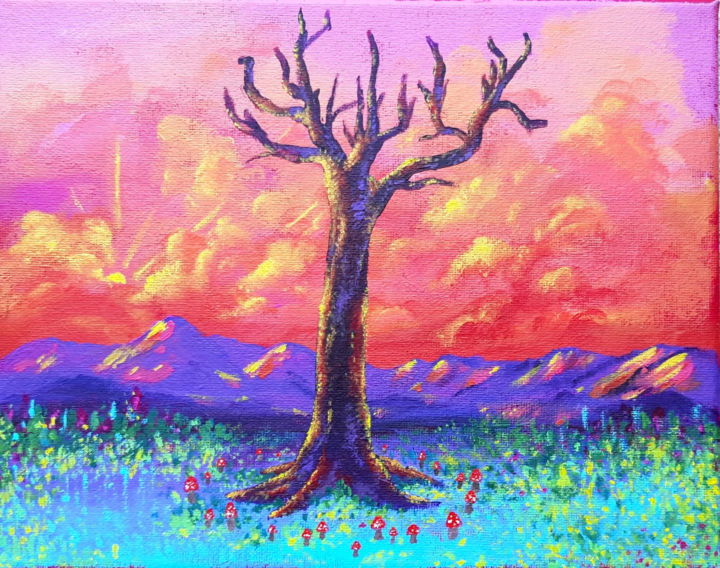 After years of hiding, this artwork from 2020 is now available again as a print. This is the sister to ‘Dreamscape’; A lone tree, barren of leaves, gives it’s nutrients to the mushrooms growing in a fairy circle along it’s corpse in this artwork entitled, Do You Understand?
